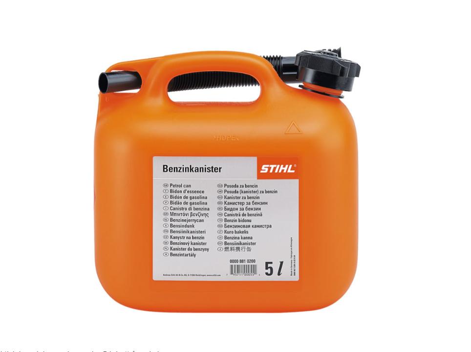 Praktisk bensinkanne i oransje, 5 l. Lett å se i skogen.