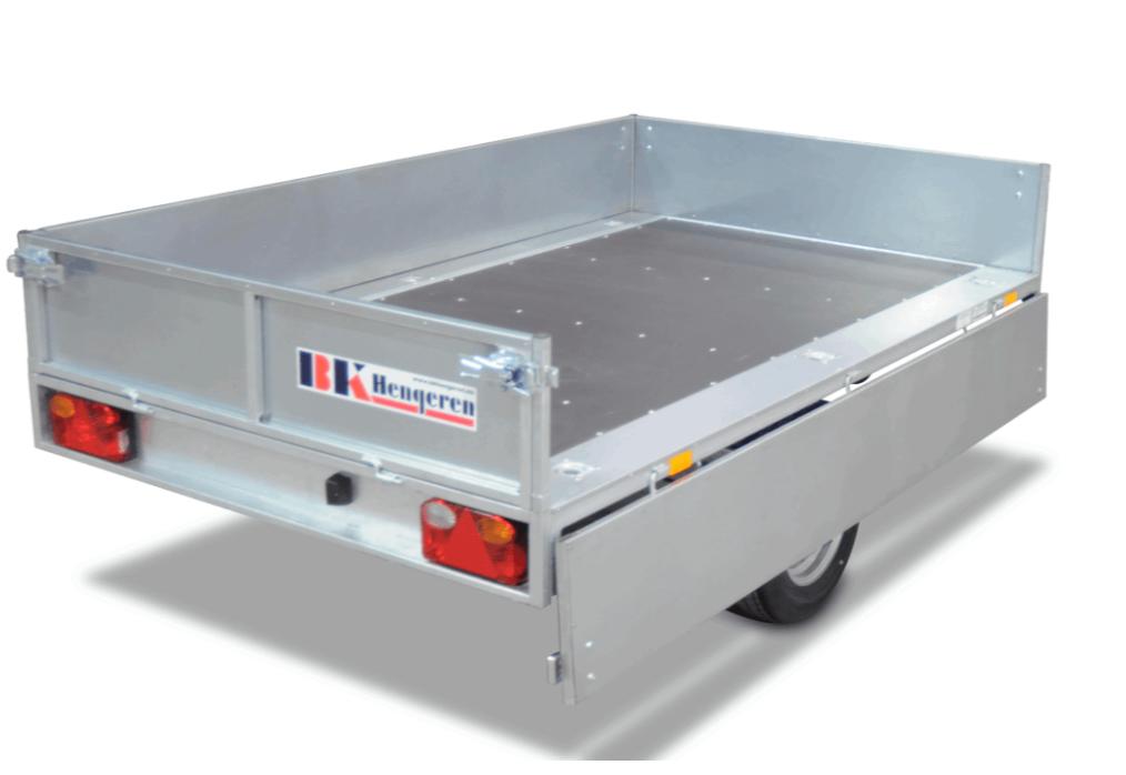 Henger leveres med forsterkede, nedfellbare sidekarmer/forluke/bakluke. Hjørnestolpene kan tas av. Standard med utvendige og innvendige surrefester. Forsterket lyspanel. Helsveiset og varmgalvanisert Hengeren kan leveres med forhøyningskarmer, nettingkarmer, glassfibertopp, presenning.