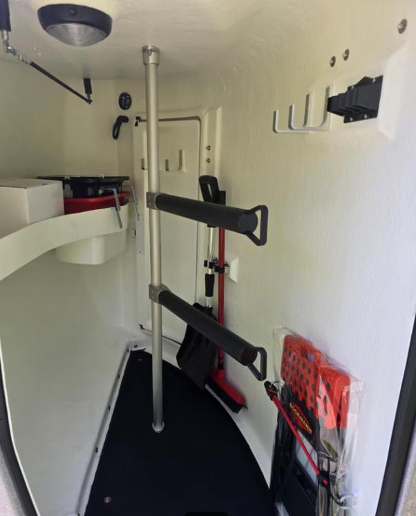 -Salrom med uttrekkbar salholder, spade, kost, speil og lagringsnett