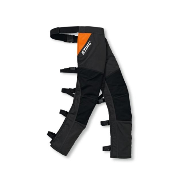 “Chaps” med verneinnlegg, er egnet for kortere arbeid med motorsag. Den er enkel å sette på med fire spenner rundt hvert bein og elastisk belte rundt livet. Reflekterende STIHL-logo på høyre side og utvidet område for kuttbeskyttelse i henhold til EN 381. Lett og pustende. Farge: antrasitt og oransje varselfarge. Materiale ytterstoff: 65 % polyester og 35 % bomull. Verneklasse 1 (= 20 m/s). Lengde 100 cm. One size.