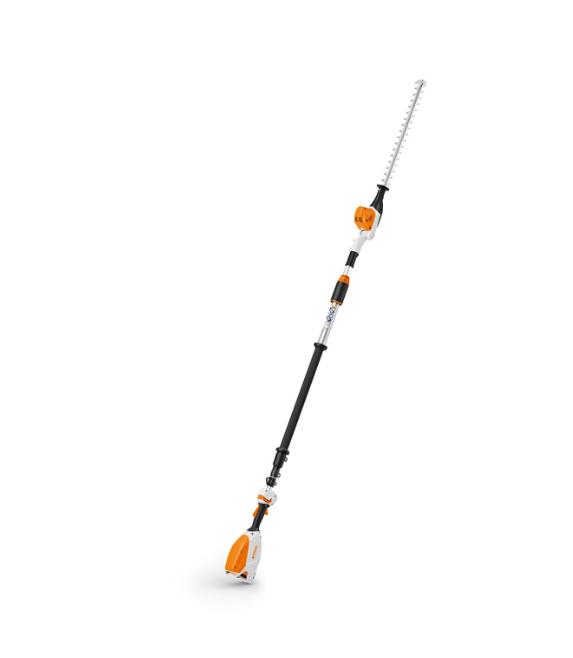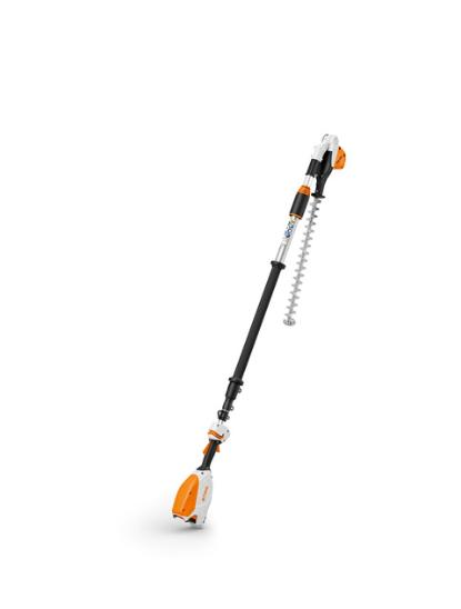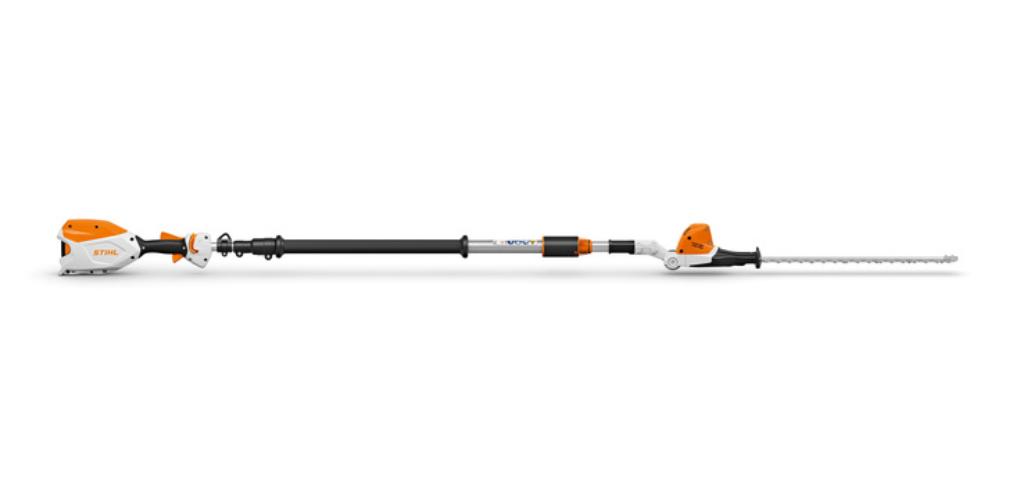Batteridrevet hekksaks med teleskopskaft for ekstra lang rekkevidde. Spesielt egnet for beskjæring av høye hekker og busker samt for kutting av planter nær bakken. Firkantet teleskopskaft gjør den både mer robust og stabil. Knivhodet kan justeres 115 ° og er derfor godt tilpasset for både topp-, side- og bunnkutt. Hekksaksen er utstyrt med 50 cm lang kniv som er slipt på begge sider, trinnløs hastighetskontroll og intuitivt betjeningshåndtak som tilbakestiller seg selv. Transportlengde 180 cm, total lengde 260 – 330 cm.