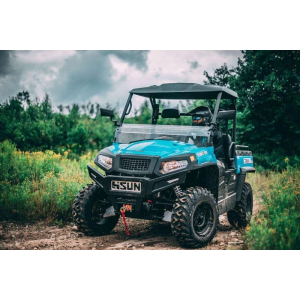 Hisun HS590 er en virkelig arbeidshest med et stort plan som også kan tippes! Solide sidedører beskytter mot vær og vind. Den har 2500 lbs vinsj, servostyring, 12” lettmetallfelger, tilhengerfeste og sikkerhetsbelter. Maskinen er stabil og lett å kjøre. Den går mykt og fint både på og utenfor veien. UTV – Utility Terrain Vehicle – er en videreutvikling av ATV. Mange som har en UTV setter pris på å kunne ta med seg familie og venner når de er ute og farter. Først og fremst er det fortsatt en god og pålitelig arbeidskollega! Arbeidet går raskt og enkelt når man f.eks. skal ut i skogen eller bringe fôr til dyrene. Uansett hvilken modell du velger, får du mye maskin og utstyr for pengene. Både rattet og de komfortable setene kan justeres ut i fra førerens lengde for å gi den beste komfort. Alle maskinene har CVT automatgir. Alle UTV-modellene er traktorregistrerte og har 3 års garanti. Tilbehør som vinsj, slepekrok, snøplog og tilhenger gjør at du få ekstra mye ut av maskinen i det daglige arbeidet. HS5590 UTV T3B = 60 km/t -2 personer – føres av personer med bilsertifikat
