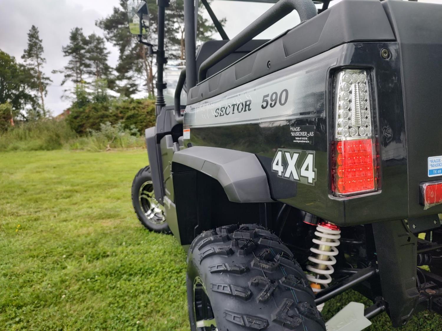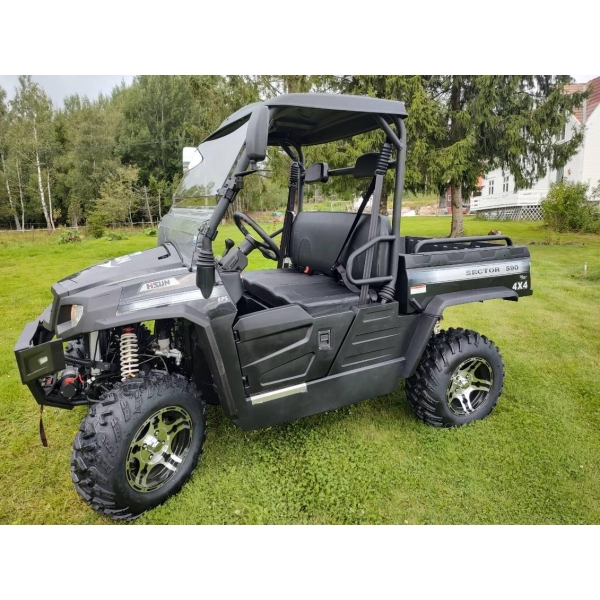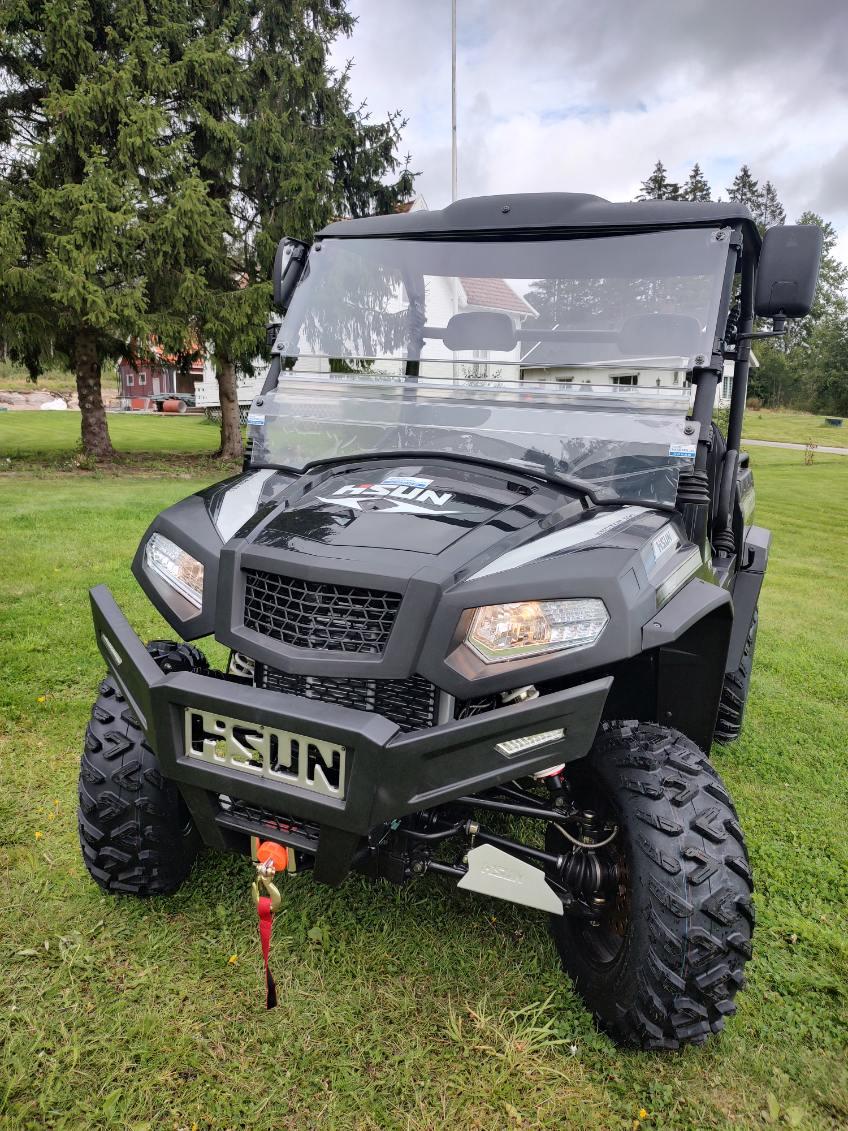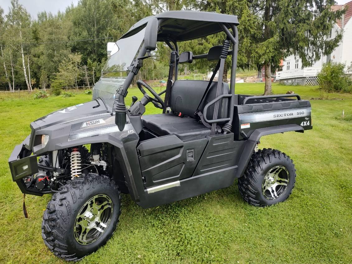 Hisun HS590 er en virkelig arbeidshest med et stort plan som også kan tippes! Solide sidedører beskytter mot vær og vind. Den har 2500 lbs vinsj, servostyring, 12” lettmetallfelger, tilhengerfeste og sikkerhetsbelter. Maskinen er stabil og lett å kjøre. Den går mykt og fint både på og utenfor veien. UTV – Utility Terrain Vehicle – er en videreutvikling av ATV. Mange som har en UTV setter pris på å kunne ta med seg familie og venner når de er ute og farter. Først og fremst er det fortsatt en god og pålitelig arbeidskollega! Arbeidet går raskt og enkelt når man f.eks. skal ut i skogen eller bringe fôr til dyrene. Uansett hvilken modell du velger, får du mye maskin og utstyr for pengene. Både rattet og de komfortable setene kan justeres ut i fra førerens lengde for å gi den beste komfort. Alle maskinene har CVT automatgir. Alle UTV-modellene er traktorregistrerte og har 3 års garanti. Tilbehør som vinsj, slepekrok, snøplog og tilhenger gjør at du få ekstra mye ut av maskinen i det daglige arbeidet. HS5590 UTV T3B = 60 km/t -2 personer – føres av personer med bilsertifikat