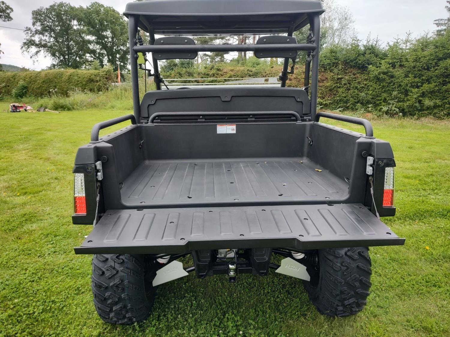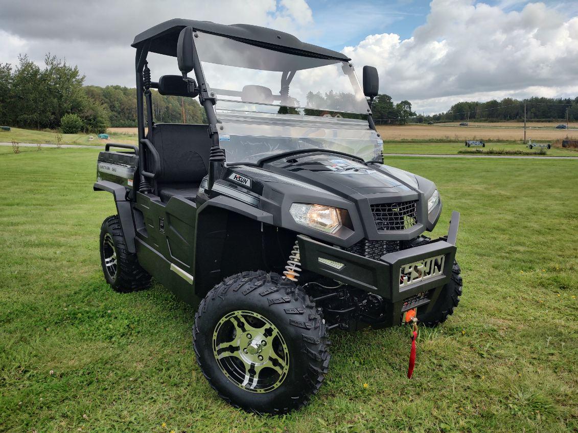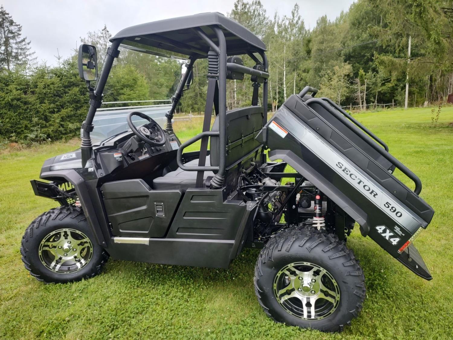 Hisun HS590 er en virkelig arbeidshest med et stort plan som også kan tippes! Solide sidedører beskytter mot vær og vind. Den har 2500 lbs vinsj, servostyring, 12” lettmetallfelger, tilhengerfeste og sikkerhetsbelter. Maskinen er stabil og lett å kjøre. Den går mykt og fint både på og utenfor veien. UTV – Utility Terrain Vehicle – er en videreutvikling av ATV. Mange som har en UTV setter pris på å kunne ta med seg familie og venner når de er ute og farter. Først og fremst er det fortsatt en god og pålitelig arbeidskollega! Arbeidet går raskt og enkelt når man f.eks. skal ut i skogen eller bringe fôr til dyrene. Uansett hvilken modell du velger, får du mye maskin og utstyr for pengene. Både rattet og de komfortable setene kan justeres ut i fra førerens lengde for å gi den beste komfort. Alle maskinene har CVT automatgir. Alle UTV-modellene er traktorregistrerte og har 3 års garanti. Tilbehør som vinsj, slepekrok, snøplog og tilhenger gjør at du få ekstra mye ut av maskinen i det daglige arbeidet. HS5590 UTV T3B = 60 km/t -2 personer – føres av personer med bilsertifikat