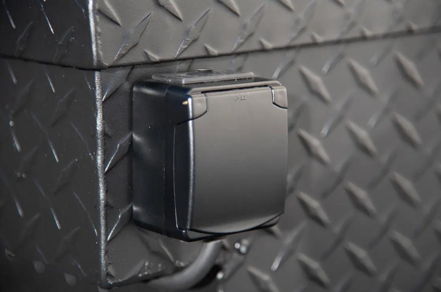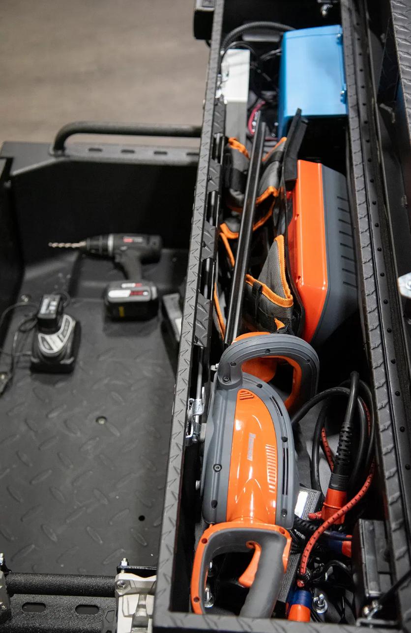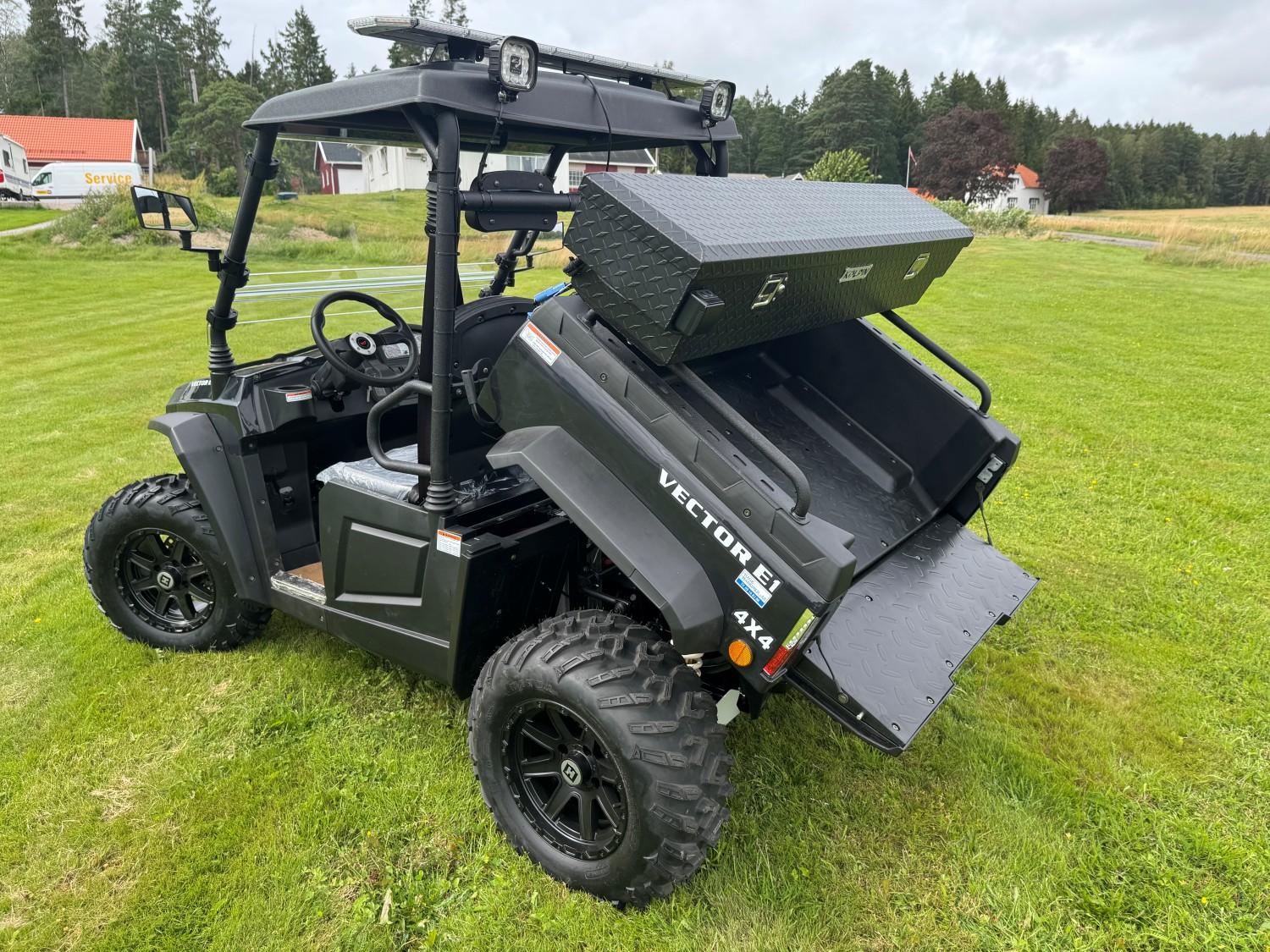 Verdens første elektriske UTV med Powerbank – en powerbank på hjul! Den er bygget robust og værbestandig for å tåle de tøffeste utendørsforholdene. Kjøretøyet er også rigget med varsellysbjelke, arbeidslys foran og bak, verktøykasse med 230 v strømuttak og verktøyholder.