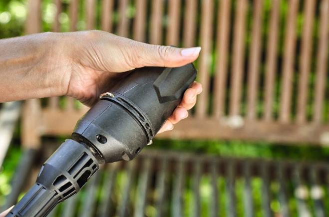 STIHL RE 100 PLUS CONTROL har også en 3-i-1-dyse med integrert rotordyse. Du bytter raskt og enkelt mellom flatstråledyse, rotordyse og rengjøringsmiddelstråle ved å dreie på dysen. Slik blir arbeidet mer fleksibelt, du må ikke lenger bytte dyse. Med rengjøringsmiddeldysen kan du bruke rengjøringsmiddel fra rengjøringstanken på høytrykksvaskeren..