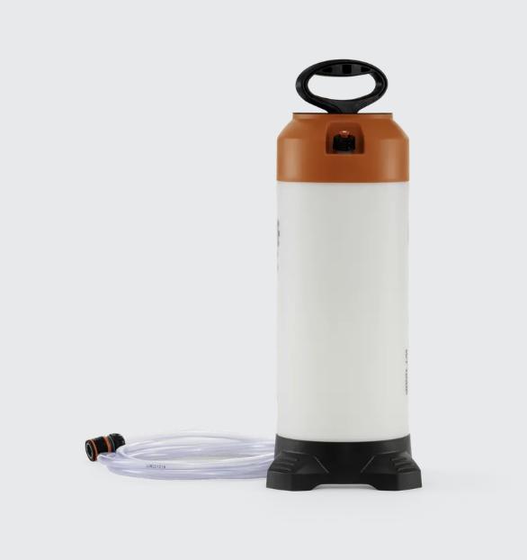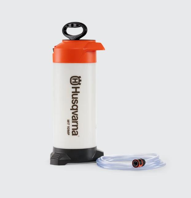 Hvis det ikke er noen vannforsyning i nærheten, kan du bruke en trykksatt vanntank. Ved å pumpe på håndtaket noen ganger får du det nødvendige trykket. Tanken rommer 10 liter og leveres komplett med slange som er koblet til våtkappesettet på maskinen.