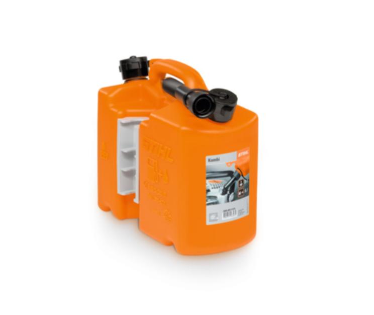 Komplett og praktisk kombikanne, oransje, for både bensin (5 l) og olje (3 l). Inklusiv helletut. Med UN-godkjenning.