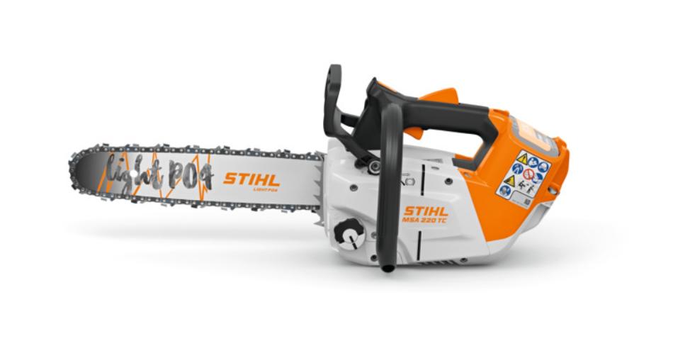 Stihl MSA 220 TC er en kraftig batteridrevet topphåndsag til kutting av stammedeler, korrigering av trekroner og til fjerning av dødt treverk. Med batteriet AP-batteriet 300 S er det den kraftigste topphåndsagen på markedet. Den er svært komfortabel å betjene takket være elektronisk betjeningssystem med opplåsingstast som enkelt aktiverer sagen. Kontrollpanel med 180° LED-visning gir informasjon om motorsagens driftstilstand og om innkoblet kjedebrems. En topphåndsag er spesielt utviklet til arbeid oppe i treet og skal bare brukes av utdannede arborister.