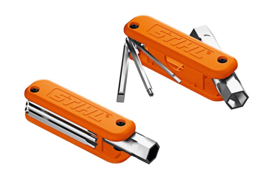 Praktisk og multifunksjonelt kvalitetsverktøy i robust materiale som gir enkel tilgang til alt av nødvendig verktøy. Skrutrekker på 3,5 mm som kan brukes til å justere forgasseren og rengjøre sporene, Torx-skrutrekker TX 27 og kombinøkkel for tennplugger og flensmuttere.