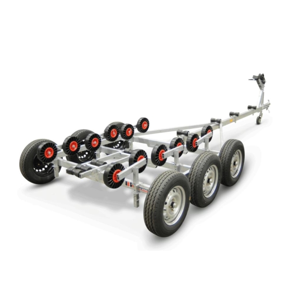 Helsveiset og varmgalvanisert. Tre akslet for å få god vektfordeling på opplagshengeren. Kjølruller med stålkjerne, kraftig vinsj. Fire støttehjul på hver side. Kan påmonteres lengre sidestøtter (70cm) dersom det er behov.