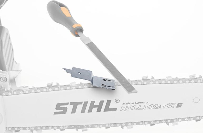 For manuell behandling av dybdemåler. Materiale i herdet stål med spesialbelegg. To innstillinger for harde og myke tresorter. Med kroken kan både spor og sverd, og sverdets oljehull rengjøres.