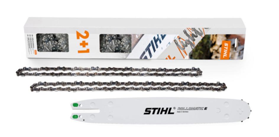 Praktisk pakke til din STIHL motorsag MS 017, MS 170 og MS 171. Inneholder 2 stk 3/8″ PM3 1,1 mm kjeder med 44 drivlenker og 1 stk Rollomatic E sverd, 12″ 30 cm.