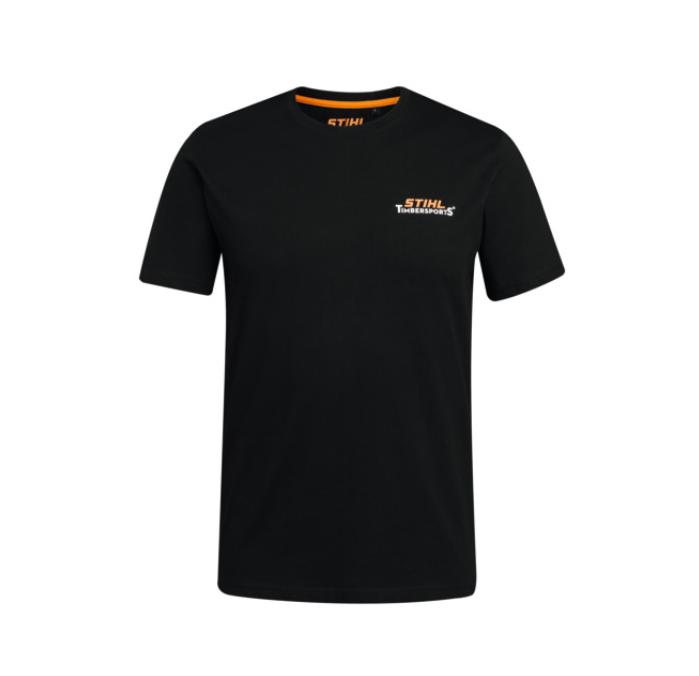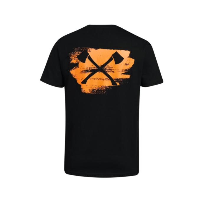 Et diskret uttrykk forfra, men med et tydelig statement på baksiden! En klassisk svart unisex t-skjorte med to kryssede økser på en STIHL-oransje bakgrunn på ryggen.