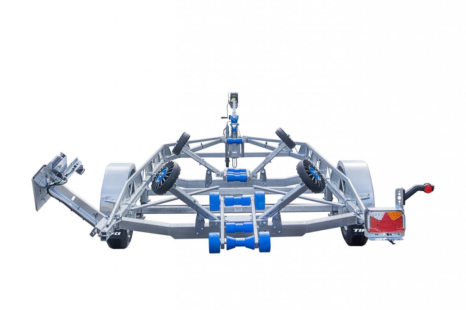 En bremset båthenger for båter opp til 22 fot. Med brems på hengeren er det tillatt å kjøre i opptil 80km/t på veier som har den fartsgrensen eller høyere. Helsveiset og varmgalvanisert dobbel A-ramme gir en stivere og meget solid henger. 2 Automatiske vugger med store hjul, og 7 kjøruller. Den fremre kjølrullen kan justeres i høyden for å tilpasses skroget. Opptrekket blir derfor ekstra skånsomt for båten. Vinsjtårnet kan flyttes i hengerens lengderetning, så man kan balansere båten perfekt på tilhengeren. Den er utstyrt med en myk bauggummi som beskytter skroget. En anerkjent Goliath vinsj med 3 gir følger med. Baklyktene er utvippbare med gassdemper som holder de på plass, så det er ingen behov for å ta de av, og fikle med ledninger. Hengeren er utstyrt med LED lys rundt baut, også baklys er LED. Ledningene er skjult i rammen. Stålskjermer som tåler opptil 100kg, gir lettere tilgang til båten når den står på hengeren. Surrefester til stropper er integrert i hengerens ramme, foran- i midten -og bak på hengeren. Midtmontert støttehjul foran. God kvalitet, enkel i bruk og skånsom mot båten.