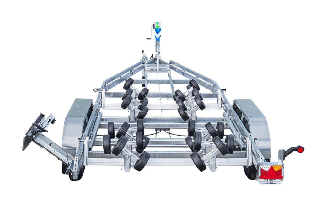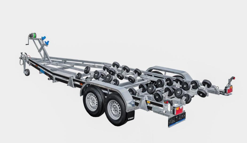 En bremset båthenger for båter opp til 23 fot. Med brems på hengeren er det tillatt å kjøre i opptil 80km/t på veier som har den fartsgrensen eller høyere. Helsveiset og varmgalvanisert dobbel A-ramme av firkantrør gir en stivere og meget solid henger. Multirullersystemet består av 32 store kjølruller som parvis automatisk justerer seg etter båtens skrog. Passer de aller fleste skrogtyper. Opptrekket blir derfor ekstra skånsomt for båten. Vinsjtårnet kan flyttes i hengerens lengderetning, så man kan balansere båten perfekt på tilhengeren. Den er utstyrt med dobbel myk bauggummi som beskytter skroget godt. En anerkjent kraftig Goliath vinsj følger med. Baklyktene er utvippbare med gassdemper som holder de på plass, så det er ingen behov for å ta de av, og fikle med ledninger. Hengeren er utstyrt med LED lys rundt baut, også baklys er LED. Ledningene er skjult i rammen. Stålskjermer som tåler opptil 100kg, gir lettere tilgang til båten når den står på hengeren. Surrefester til stropper er integrert i hengerens ramme, foran- i midten -og bak på hengeren. 14 tommers hjul gjør den fin å kjøre også i ulendt terreng. God kvalitet, enkel i bruk og skånsom mot båten.