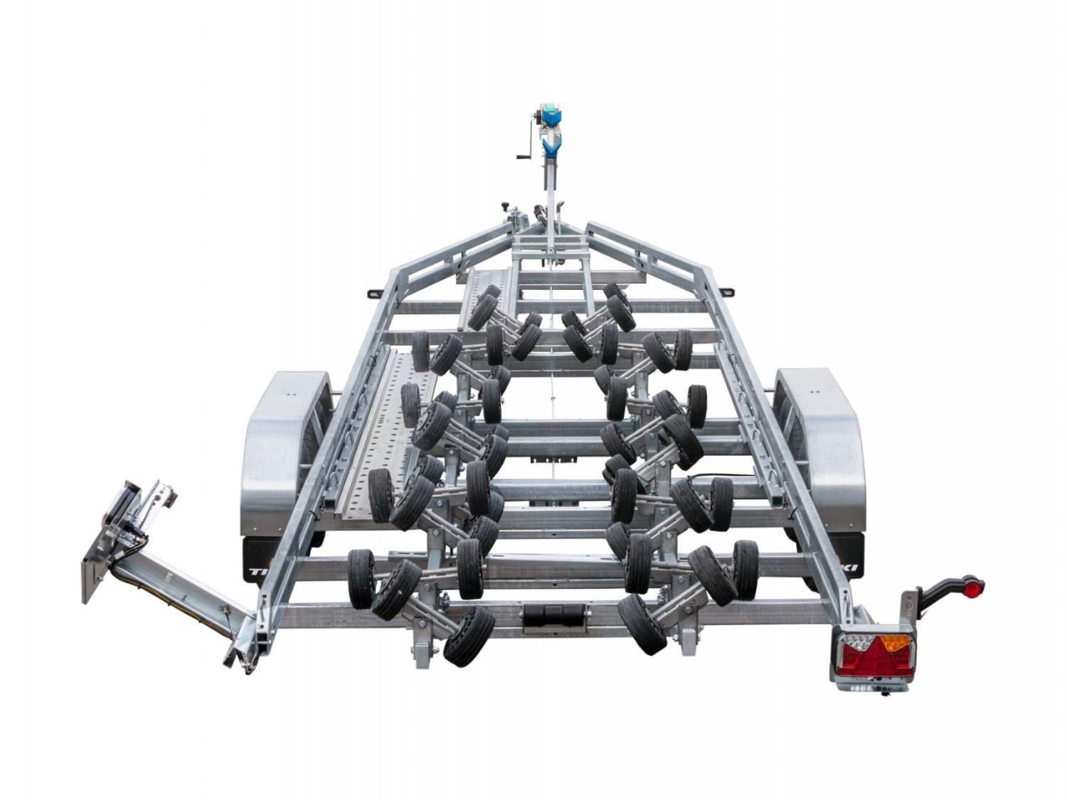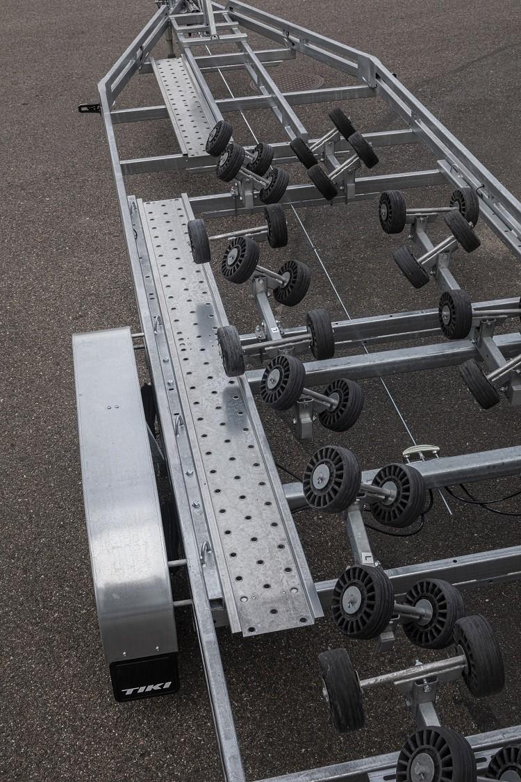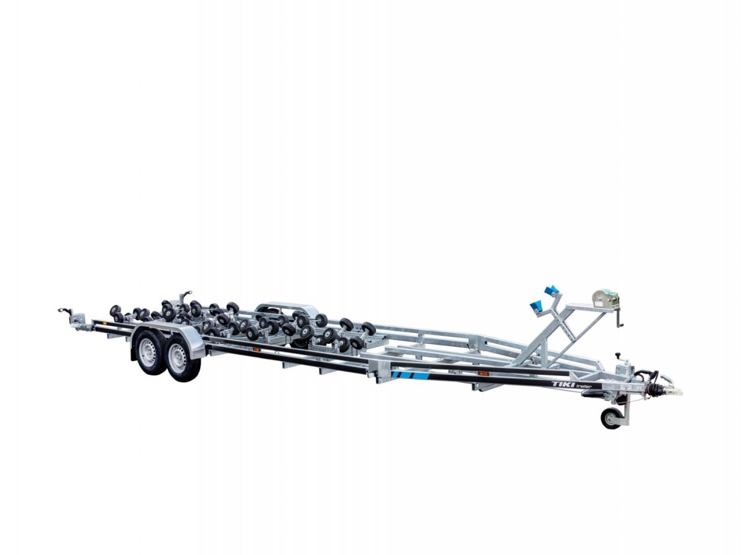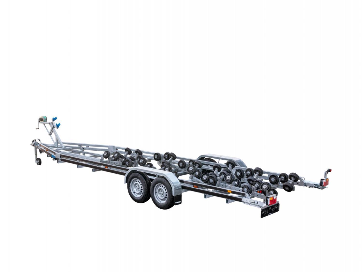 En bremset båthenger for båter opp til 30 fot og nyttelast på 2512kg. Med brems på hengeren er det tillatt å kjøre i opptil 80km/t på veier som har den fartsgrensen eller høyere. Helsveiset og varmgalvanisert dobbel A-ramme av firkantrør gir en stivere og meget solid henger. Multirullersystemet består av 48 store kjølruller som parvis automatisk justerer seg etter båtens skrog. Passer de aller fleste skrogtyper. Opptrekket blir derfor ekstra skånsomt for båten. Vinsjtårnet kan flyttes i hengerens lengderetning, så man kan balansere båten perfekt på tilhengeren. Den er utstyrt med dobbel myk bauggummi som beskytter skroget godt. En anerkjent kraftig Goliath vinsj følger med. Baklyktene er utvippbare med gassdemper som holder de på plass, så det er ingen behov for å ta de av, og fikle med ledninger. Hengeren er utstyrt med LED lys rundt baut, også baklys er LED. Ledningene er skjult i rammen. Stålskjermer som tåler opptil 100kg, gir lettere tilgang til båten når den står på hengeren. Surrefester til stropper er integrert i hengerens ramme, foran- i midten -og bak på hengeren. 14 tommers hjul gjør den fin å kjøre også i ulendt terreng. 2 gangbruer er standard utstyr. God kvalitet, enkel i bruk og skånsom mot båten.