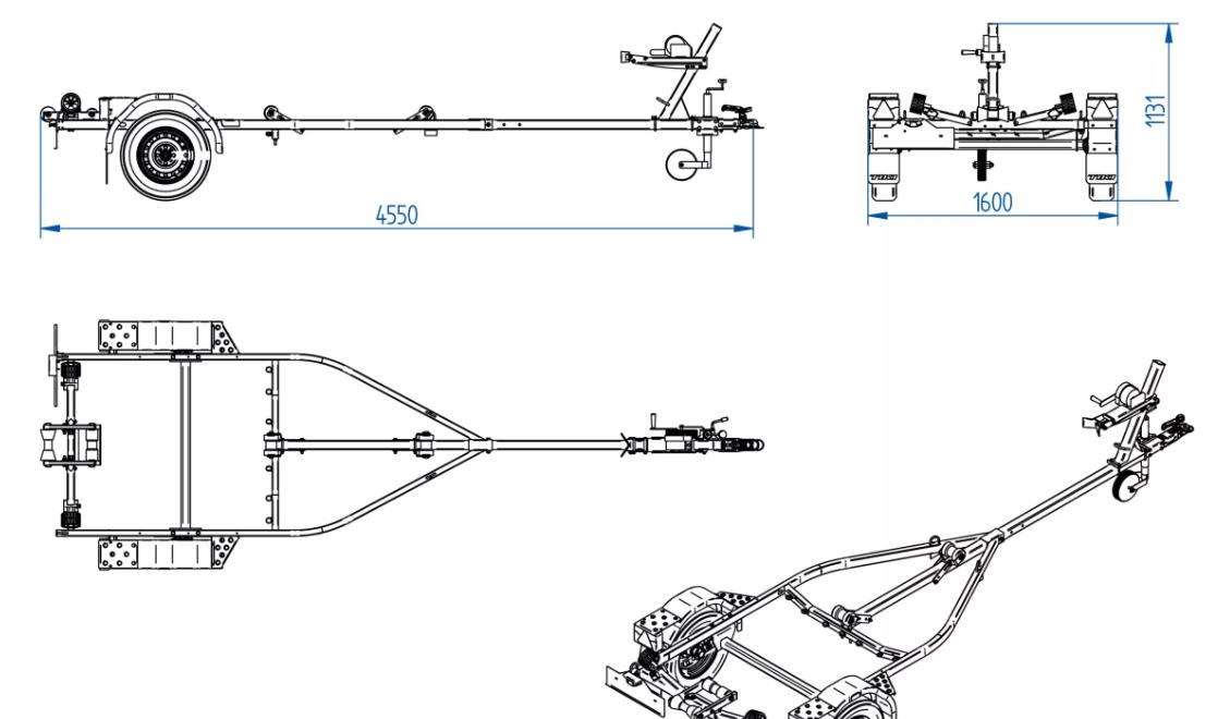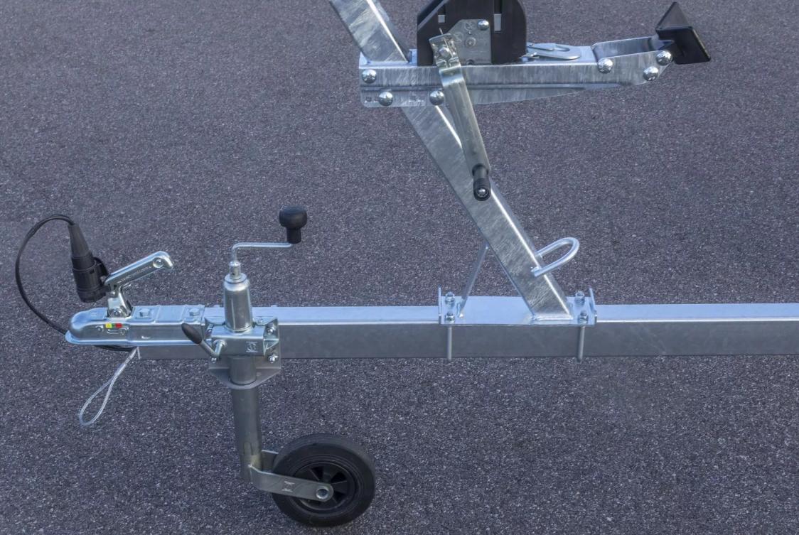 Rammen med forlengede sidebjelker øker stabiliteten og sikkerheten under kjøring. Den justerbare trekkstangen gjør at hengeren kan justeres etter båtens lengde og tyngdepunkt. På vinsjtårnet er det mulig å justere høyden på vinsjen og nesestøtten, samt vinkelen i forhold til bakken. En vinsj med brems sørger for komfortabel og sikker drift. Støttehjulet støttes fra to punkter for tryggere og mer praktisk forflytning av båten uten tauekjøretøy. Vanntette nav sikrer lengre levetid for hjullagrene. Tilhengerrammen er utstyrt med store, sterke surrekroker for å feste båten sikkert. Justerbare sidestøtter og en vippemekanisme styrer båten mot hengeren. Step-on-fendere og step-on-bord i metall gir bedre tilgang til båten på hengeren. Baklyktene er festet til tilhengerens skjermer. Takket være dette kan tilhengeren betjenes uten å flytte lysene.