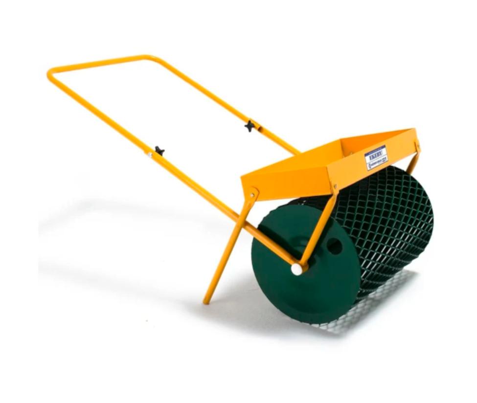 Gittertrommel i solid strekkmetall. Egner seg spesielt godt til nyanlegging av gressplen. Gitteret vil spre litt jord over såfrøene. Kasse med mulighet for å legge på ekstra vekt. Arbeidsbredde 50 cm