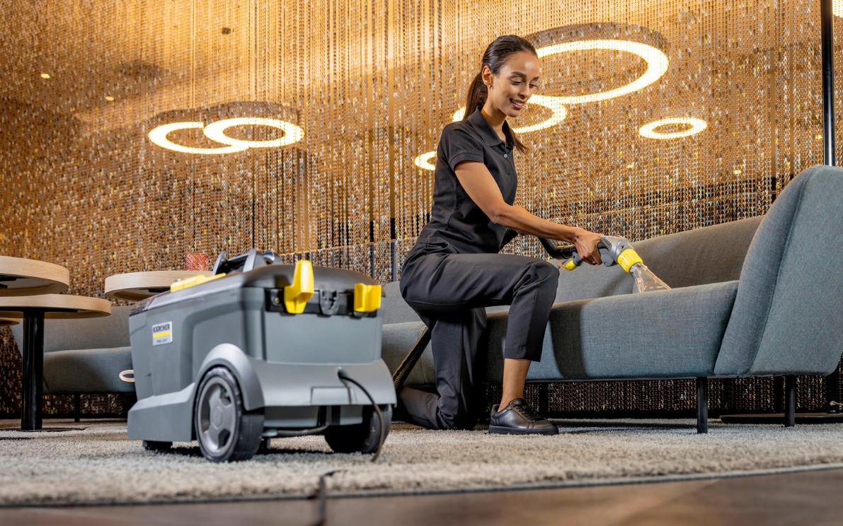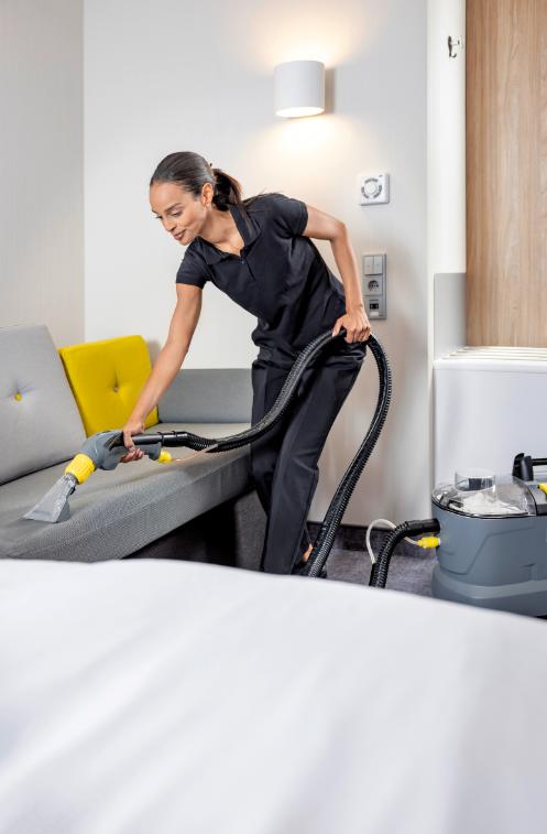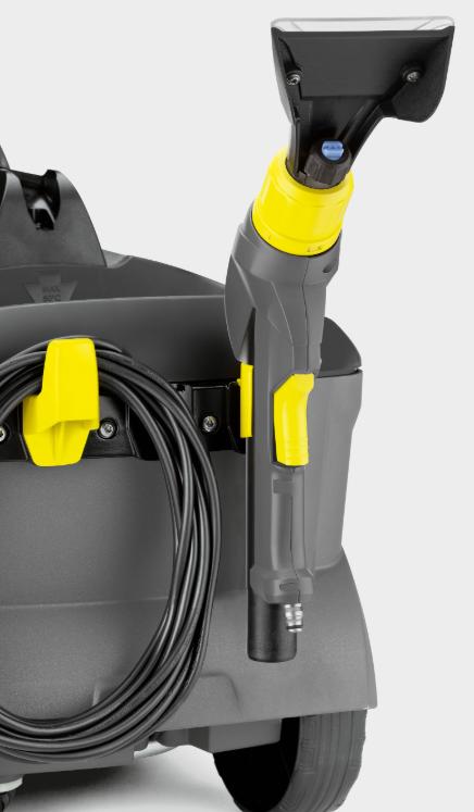 Den profesjonelle møbel- og tepperenseren Puzzi 10/1 fra Kärcher leverer fremragende sugekraft, sikrer hygieniske rengjøringsresultater og sørger for at tekstiloverflater kan tas i bruk raskt igjen. Maskinen sprøyter rengjøringsløsningen dypt inn i tekstilfibrene, og suger deretter opp igjen den oppløste skitten. Dette gjør den perfekt for grundig rengjøring av møbler, tepper og andre tekstiloverflater. Puzzi 10/1 er ideell til rengjøring for kvalitetsbeviste private, renholdsbyråer, hotell- og restaurantbransjen eller for rengjøring av bilinteriør. Lokket på maskinen, møbelmunnstykket og gulvmunnstykket er transparent, slik at du enkelt kan se skittenvannet. Store trykknapper, som kan betjenes med både hånd og fot, øker brukervennligheten.